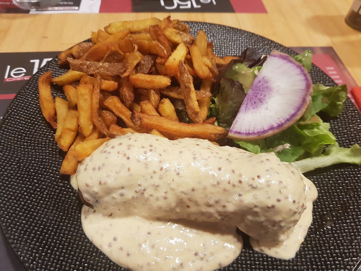 Try the salmon...delicious! The veggies - fries and extras were nice and hot. Go early to assure better seating and hot extras! They accept " chèque vacances " ... this is great!